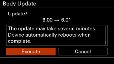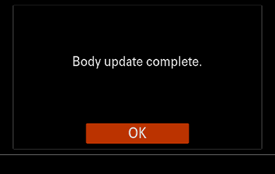 - When the update is complete, the camera will automatically restart. After restarting, press OK on the “Body update complete” screen.